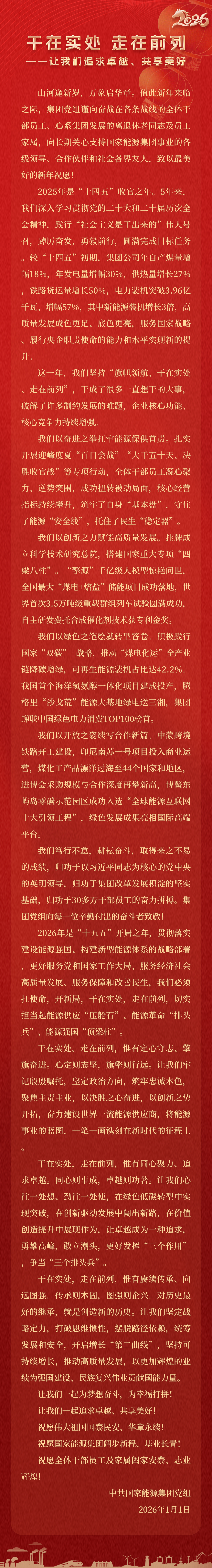 國(guó)家能源集團(tuán)胸懷“國(guó)之大者”,增產(chǎn)增供、穩(wěn)價(jià)穩(wěn)市,積極服從服務(wù)國(guó)家戰(zhàn)略、保障國(guó)家能源安全、助力國(guó)民經(jīng)濟(jì)穩(wěn)增長(zhǎng),推動(dòng)煤炭安全綠色智能、煤電清潔高效穩(wěn)定、現(xiàn)代煤化工高端多元低碳、運(yùn)輸物流協(xié)同一體、新能源多元?jiǎng)?chuàng)新規(guī)模化發(fā)展,全力擔(dān)當(dāng)能源強(qiáng)國(guó)頂梁柱,能源供應(yīng)壓艙石,能源革命排頭兵。